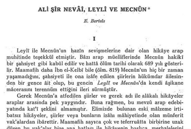 Мазкур мақола (Алишер Навоий. Лайли ва Мажнун. С.Лепкин таржимаси, Е.Бертельс сўзбошиси, 7-34 бетлар, Тошкент 1943) Мирзо Боло томонидан туркчага ўгирилиб Истанбул дорилфунуни қошидаги Туркиёт (Туркшунослик) институти “Туркиёт мажмуаси” журналининг 1946-51 йил 9-жилдида чоп этилган. 3 бобдан иборат бу мақолада муаллиф Лайли ва Мажнун билан боғлиқ қадимги афсона ва ривоятларга тўхталиб ўтади. Зарур ўринларда уларни ўзаро муқояса қилади. Бу ишқий-романтик саргузаштга батафсил тўхталаркан, болаликдан пайдо бўлган табиий муҳаббатнинг аста-секин ишққа айланиб камолга етиши, ошиқ ва маъшуқнинг ҳижронда кечган умрлари ўз ифодасини топган. Муаллиф айни пайтда достон ривоятларидаги камчилик ва нуқсонларга ҳам танқидий ёндошади. Низомий, Амир Хусрав Деҳлавий ва Алишер Навоий достонларини айрим ҳолларда солиштиради. Навоийнинг мазкур достонни халқ оғзаки ижоди таркибидан ёзма адабиётнинг бир намунасига айлантириб адабиёт тарихида ўчмас из қолдирганини ёзади.